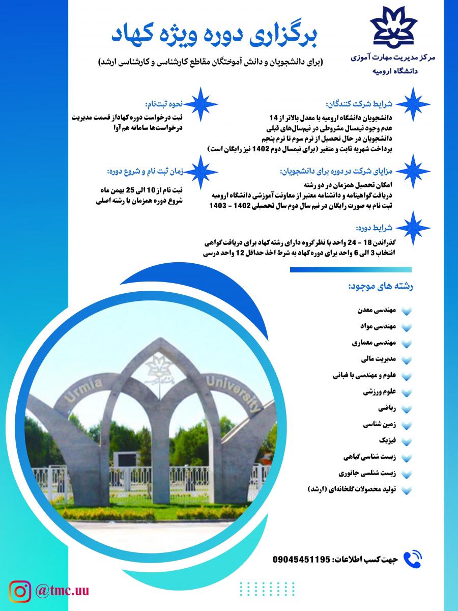 به منظور ایجاد فرصت تحصیلی برای دانشجویان دوره کارشناسی و کارشناسی ارشد در جهت تعمیق دانش و آشنایي با يکي ديگر از رشته هاي مورد علاقه شان، معاونت آموزشی و تحصیلات تکمیلی (مرکز مدیریت مهارت آموزی و مشاوره شغلی دانشجویان)، دوره هاي کهاد را هم زمان با دوره اصلي در دوره کارشناسي و کارشناسی ارشد برگزار مي نمايد.